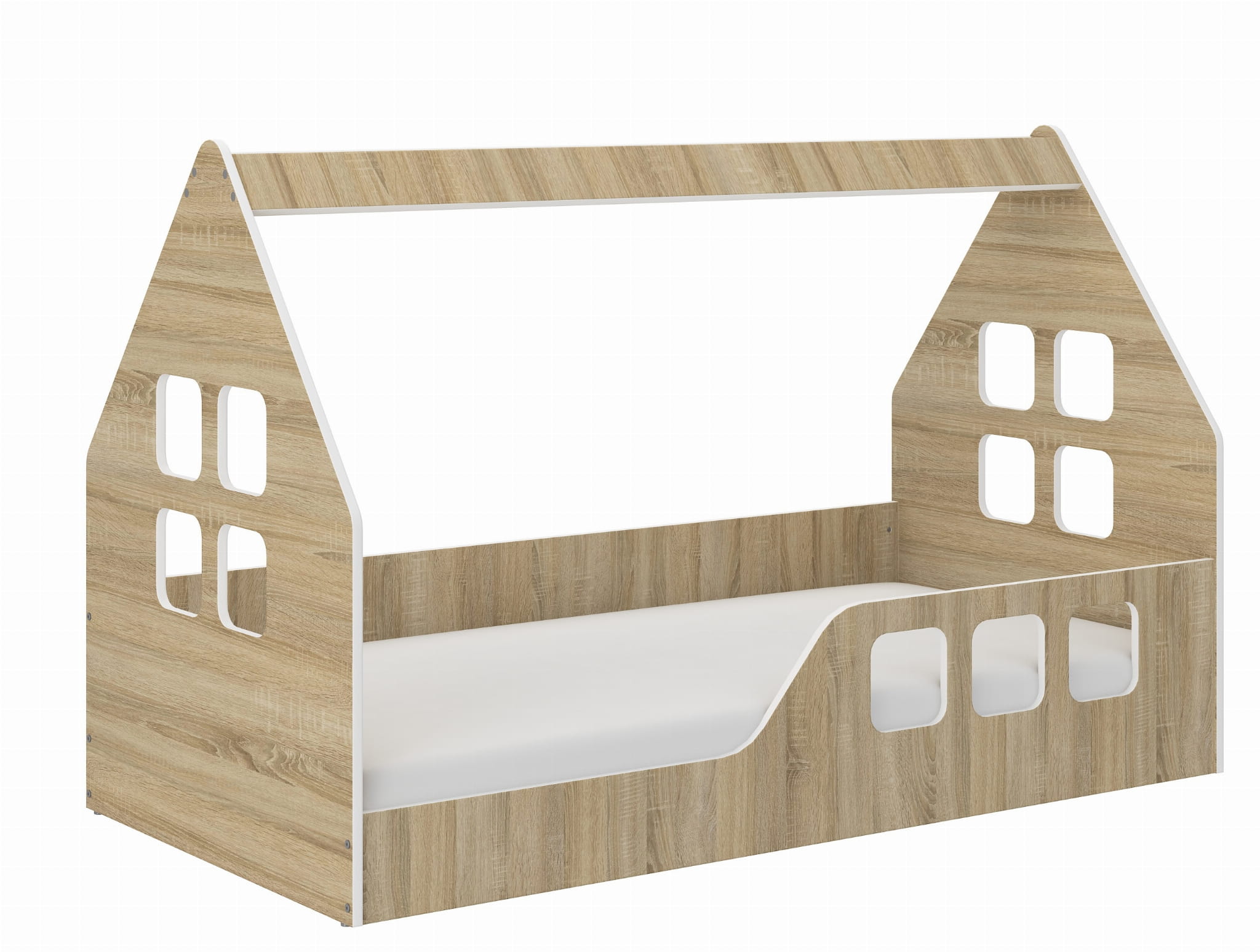 - Łóżko w kształcie domku z oknami.